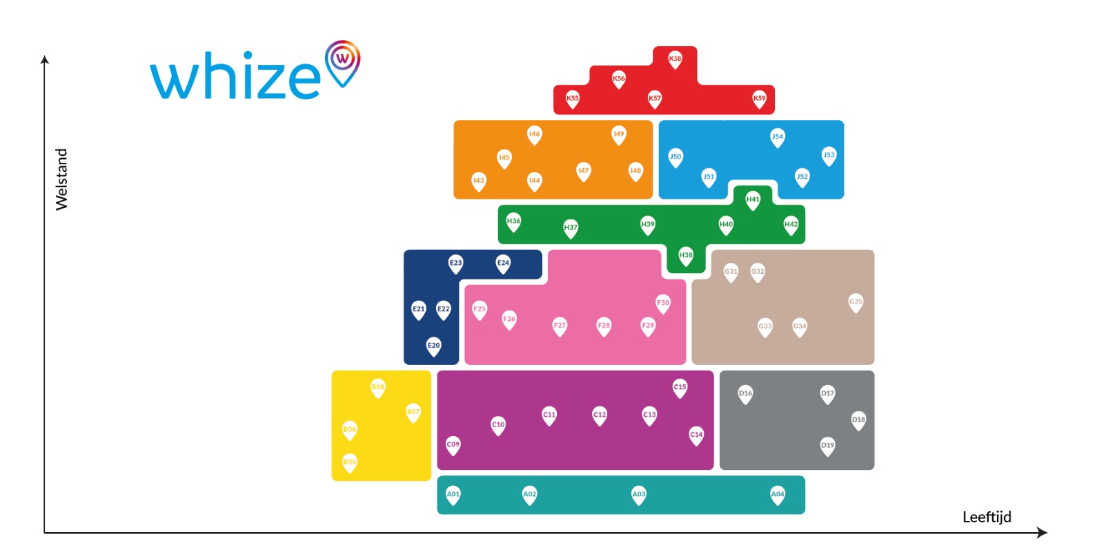 Het Whize systeem heeft alle nederlandse huishoudens onderverdeeld in 59 segmenten verdeeld over 9 groepen. Met onze